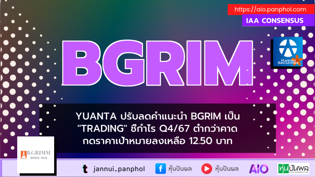 YUANTA ปรับลดคำแนะนำ BGRIM เป็น "TRADING" ชี้กำไร Q4/67 ต่ำกว่าคาด กดราคาเป้าหมายลงเหลือ 12.50 บาท