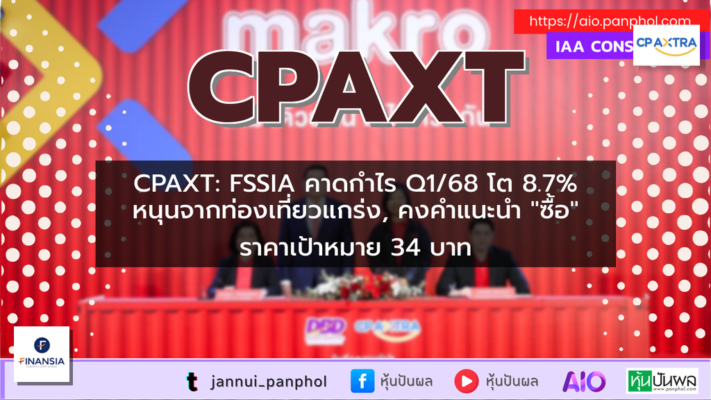 CPAXT: FSSIA คาดกำไร Q1/68 โต 8.7% หนุนจากท่องเที่ยวแกร่ง, คงคำแนะนำ "ซื้อ" ราคาเป้าหมาย 34 บาท